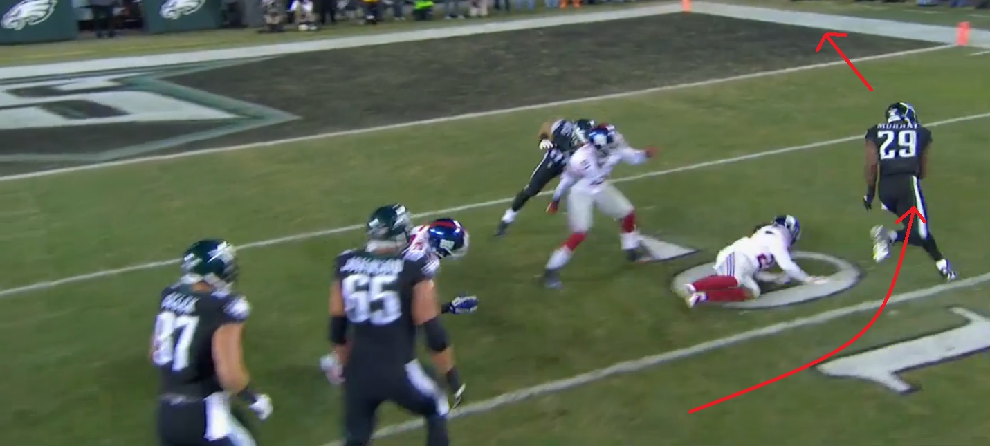 But several of Murray’s big runs against the Giants went around the end. Here’s a clip of his touchdown. Does it look like running toward the sideline is DeMarco’s problem?