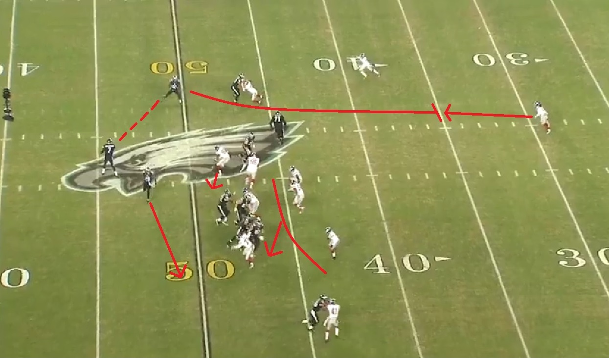 Chip didn’t mean that it’s bad to for the running back to execute the called outside run, or that he himself shouldn’t be calling them — they’re a very big part of his offense. Chip loves misdirection, and outside runs are critical to get the defense flowing one way so you can run a counter the other way, whether it’s a bootleg, a bubble screen to the other side, or a slot screen like the one that Josh Huff gained 15 yards on in the first quarter.