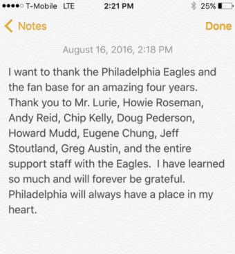 Dennis Kelly Tweets Very Kind Thank You to Eagles