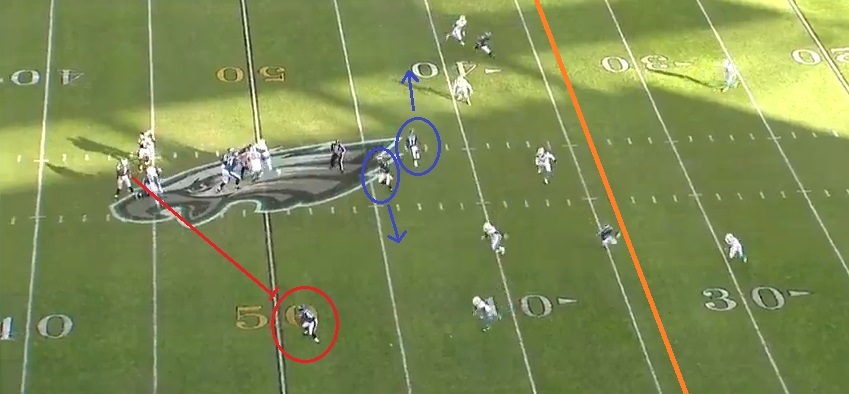 Then, after a run was stuffed, it was 2nd and 14. Bradford threw to Sproles just over the line of scrimmage, even though he had Nelson Agholor and Jordan Matthews five yards down field, crossing each other on mesh routes, wide open. Yes, Sproles is good in the open field, but on this play he was flat-footed and facing the backfield, while Agholor and Matthews (if hit in stride) were in much better position to run past nearby defenders for a big gain.