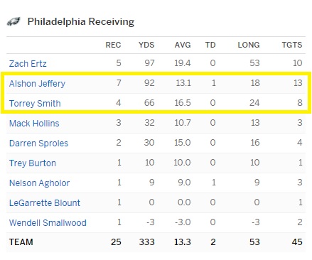 Alshon Jeffery and Torrey Smith finished with four combined targets in that first drive, matching their total targets from the entire first half of Week 1.