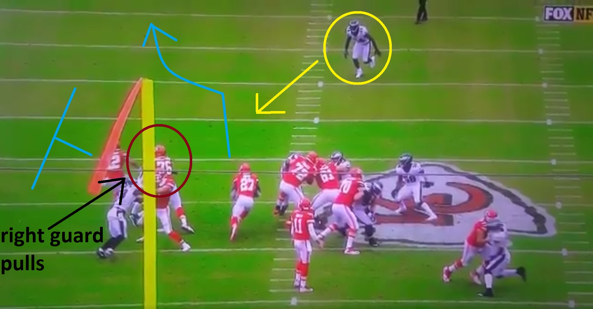 Right guard Laurent Duvernay-Tardif pulls to engage Malcolm Jenkins. Rasul Douglas is off-screen, but he takes a bit of a block from Albert Wilson and doesn’t have the foot speed to catch up.