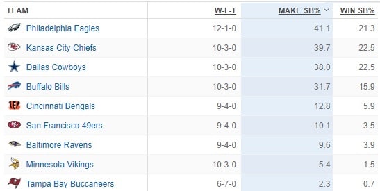 So the Eagles have the best chance to make the Super Bowl, yet Dallas has a better chance to actually win the game? Okay then! <Bill Lumberg voice> “Uh yeahhhhhh, I’m gonna have to go ahead and disagree with you there.”