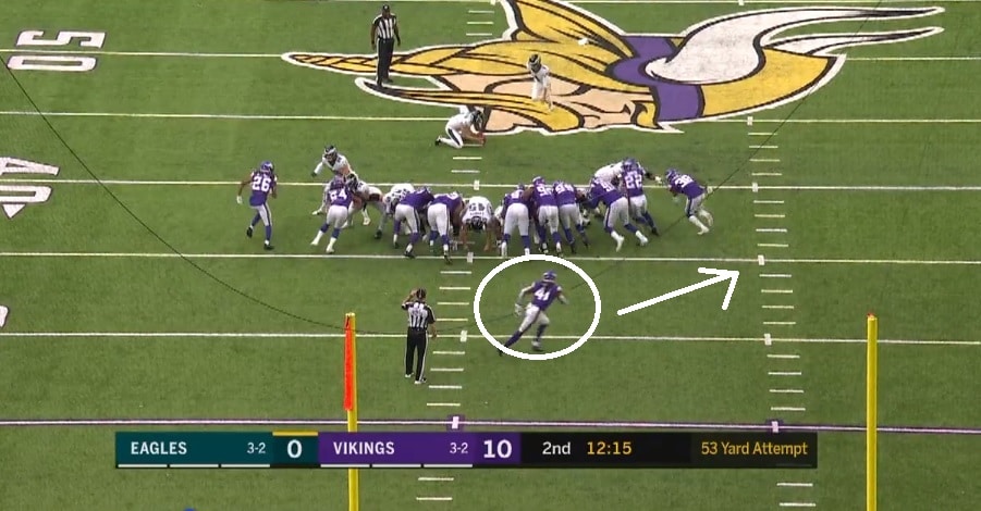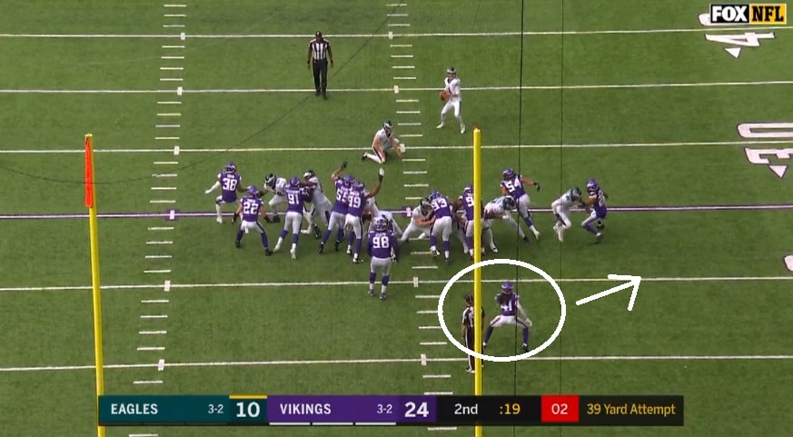 Here’s a still frame of the first field goal that Doug mentions, where #41, Anthony Harris, drifts to the strong side (field side) when the ball is snapped:
