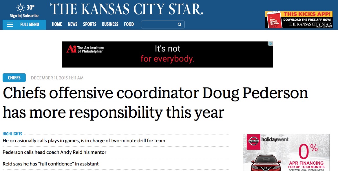 Pederson’s done a nice job with the Chiefs this year, but how much of that is Andy Reid’s doing? I mean, it’s a little concerning when a top search result for the guy gives him participation cheers for “occasionally” calling plays like a big-boy coordinator and running Reid’s two-minute drill (a sock would be more effective than Reid at running the two-minute drill):