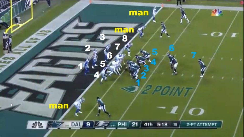 On this particular play, Dallas is just manned-up on three receivers, so they have eight guys in the box. The Eagles are running a modified pistol here with a tight end, Rodgers, lined up as a blocker to Hurts’ right. As a result, they’ve only got seven guys to block eight defenders, so Hurts either has to hit the pylon quickly or make a guy miss in open space: