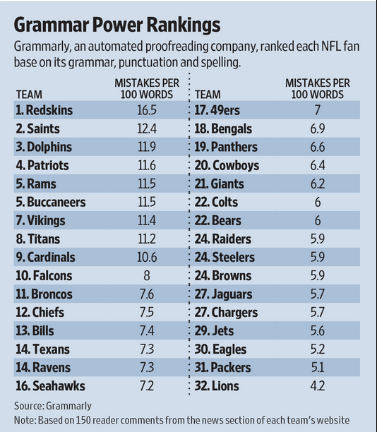 Grammer in a comment sections is like a point system on “Who’s Line is it Anyway?”, everythings made up and the points rules doesnt matter. But among the grammer in coments on the news pages of NFL teams, Eagles fans are make some of the least mistake while the lowly Washington Redskin’s fans is predictably last. Only long comments was counted here,which would seemingly be more mistake ladden and a proof reading company Grammarly checked for “more than 400 types of spelling, grammar and punctuation errors.” Off of a 150 comments, Eagles fans only averaged 5.2 mistakes per 100 words while the league worst Redskins more than triple that. Cowboys and Giants fans notched a little over 6 mistakes per 100 different words on there web sites.