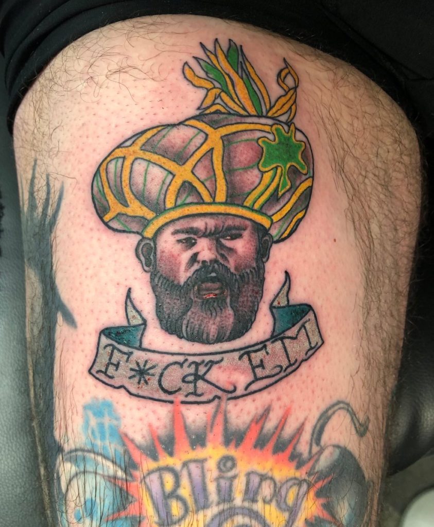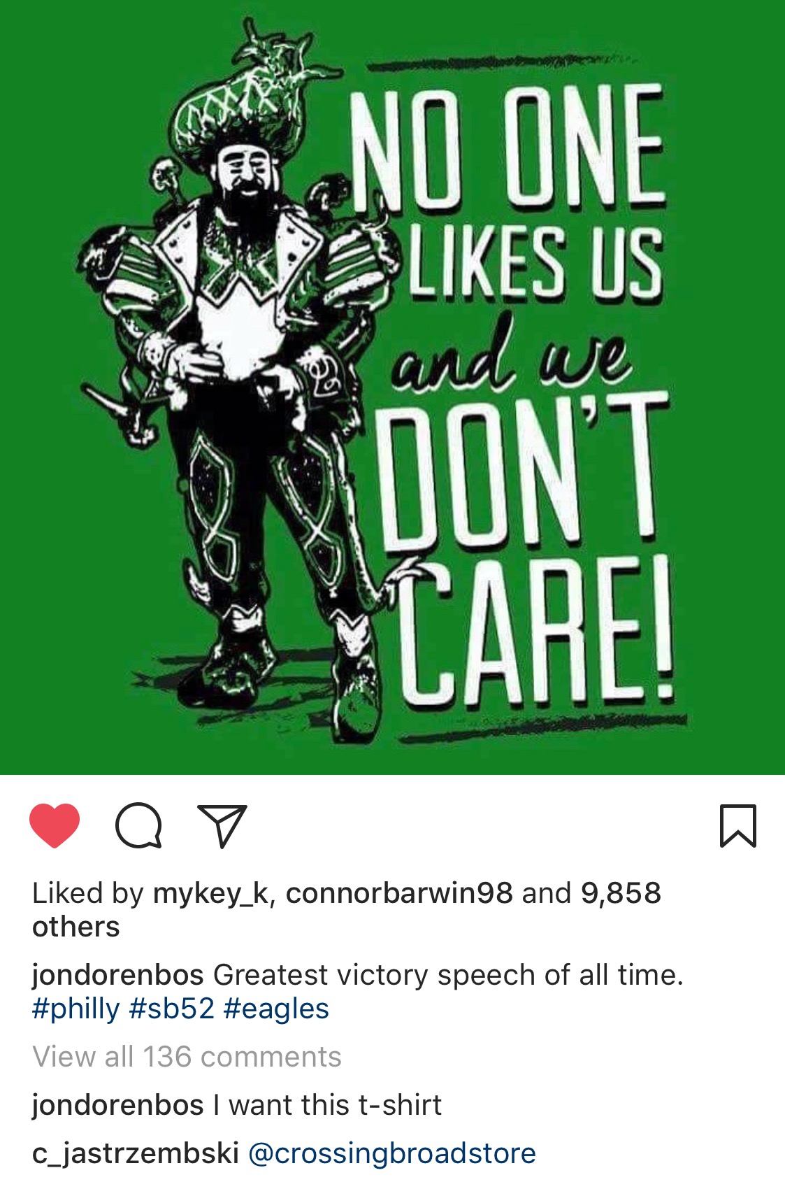 Meet Jordan Clarius, who watched a defiant Jason Kelce deliver a five-minute middle finger of a speech on the steps of the Philadelphia Museum of Art yesterday afternoon, and then promptly decided to put the face of the 6’3”, 282-pound center, clad in a Mummers costume, on his body forever. Kelce’s speech was Winston Churchill level stuff and a testament to the power of both the f-bomb and underdog narrative in this city. Say “fuck” a couple of times, call out Michael Lombardi, recount the ways your teammates were counted out and cap it with “no one likes us, we don’t care!” It was flawless elocution and a clinic on public speaking by Kelce, and he had to know it. After that speech, pretty much the only thing left for Eagles fans to do is permanently put his face on their skin.