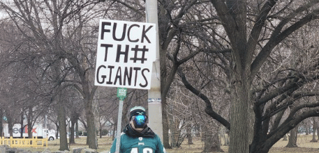 Eagles Fan Outside NovaCare with the Strangest “Fuck Th# Giants” Sign and Mask