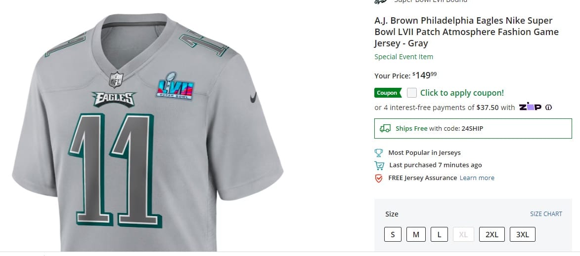 Fanatics, as you probably know, is the official partner of the NFL, and when you go to the website, there’s a section for the Eagles and section for the Chiefs, one on each side of the page. When you click through the Eagles side, they’ve got everything from a $1,700 jacket to a black shirsey with the patch, but the only actual jersey with the patch appears to be this gray one: