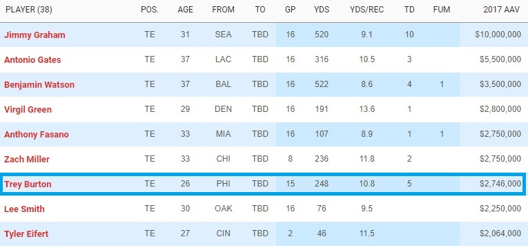 The Eagles will go into this season with Zach Ertz and probably Brent Celek for one final year. Burton will deservedly get paid and play first team snaps in 2018.