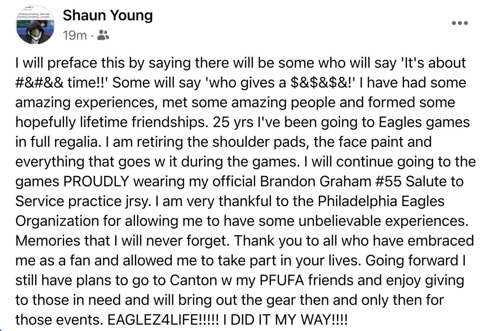 The guy who wears the shoulder pads to every Eagles game, you know him, right? Shaun Young. He’s been everywhere for years now. He’s a staple.