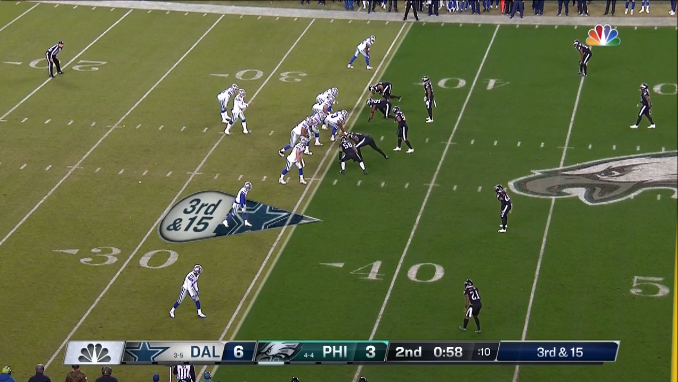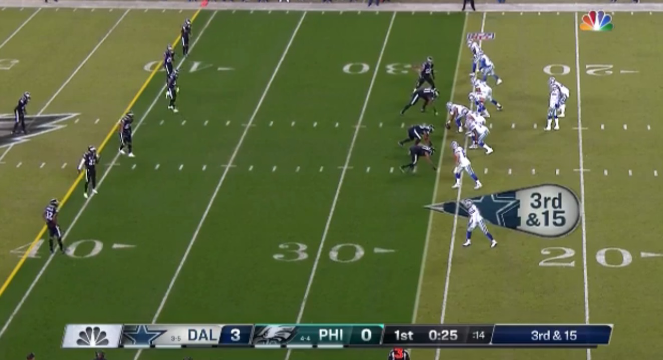 Just to be clear, there were two 3rd and 15 plays for Dallas on Sunday. This happened in the first quarter and is an example of the Eagles lining up in the picket fence look: