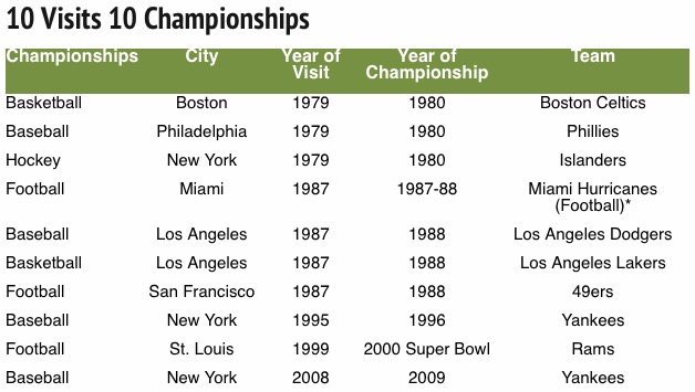 In addition to the ten championships in the year following a Papal visit, four additional teams won Championships two years following a visit from his Holiness. The Islanders and 49ers repeated in 1981 and 1989, respectively. In 1989, the Oakland A’s and the Detroit Pistons finally closed the deal with championships after losses in the World Series and the NBA Finals in 1988. Ironically, in 1988 those two teams lost to Los Angeles teams, a city the Pope also visited in 1987.