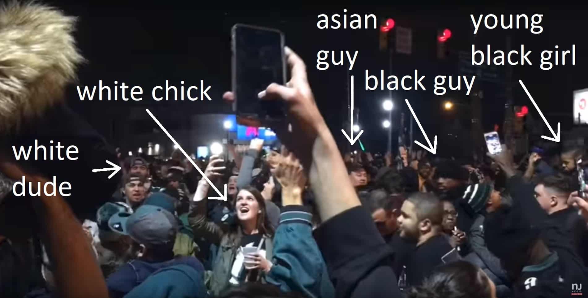 Ernest’s premise for both of these columns doesn’t work very well because it’s not just “some people of color” taking part in these Eagles (or Phillies) celebrations. It’s typically a very diverse crowd, which you know if you were out celebrating the other night. Sure, you’re going to see white people on South Broad Street in proximity to Lincoln Financial Field and predominantly white neighborhoods, but as you move throughout the city you realize that EVERYBODY is out and about. This was the case with the Super Bowl parade and 2018 NFC championship celebration, which were unifying events chock full of diversity. You didn’t even have to be there to know this. Just analyzing viral video clips you came across crowds that looked like this: