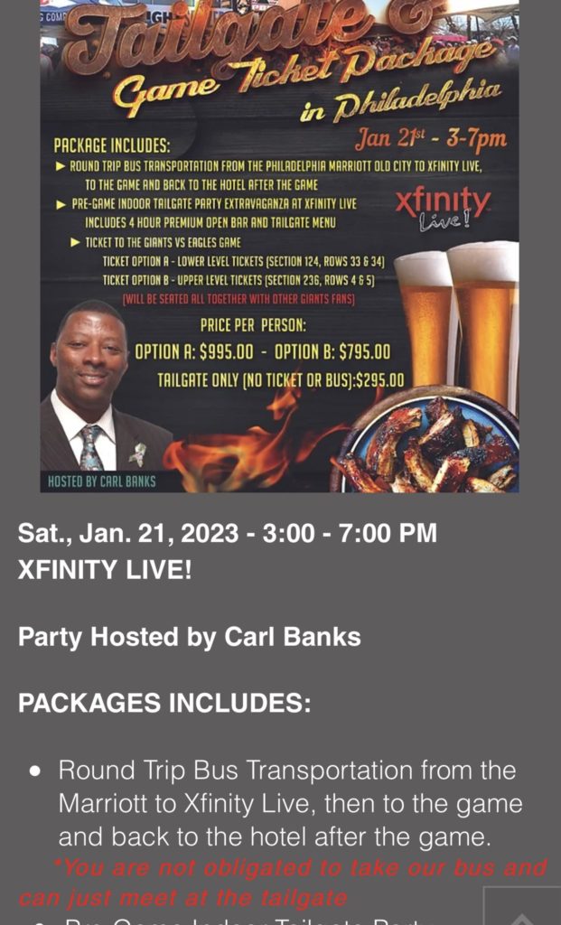 Anyway, the reason we asked about a possible violation is because Xfinity Live is the only bar/restaurant/facility at the sports complex. From an optics standpoint, it does seem a little weird that division rival’s fan group would tailgate there before a playoff game, when the place hypothetically should be packed with Eagles fans. This isn’t week 2 against the Titans, it’s a playoff game against the Giants. Keep these goofballs off our turf. This is football, not a diplomatic trip. We’re getting soft.