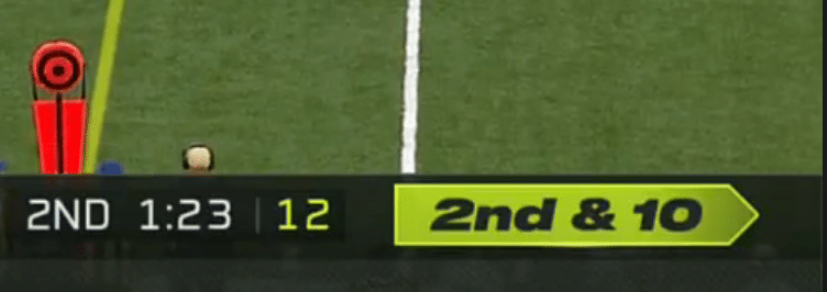 Another new quirk was a bright yellow or neon greenish down and distance marker on the bottom right-hand corner of the screen, which really stood out during the broadcast and looked like this, via DubDotDUBBY: