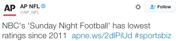 There’s a lot going on here and everyone is collectively freaking out because the NFL’s ratings are no longer ascending like unmanned rocket strapped to two Red Bull boosters. In fact, they’re down. A lot in some cases. Part of the problem is that TV viewership is declining. There is now a measurable number of people at the younger end of the 25-54 demo whose viewing habits are changing. So part of it is not an NFL problem– it’s a TV and cable problem. For example, I watched the Cubs-Dodgers game on TV on Sunday night and streamed the football game – a truly horrific matchup between two bastard teams whose coaches should have already been fired – on my iPad. That use case surely isn’t accounted for in the Nielsen ratings.