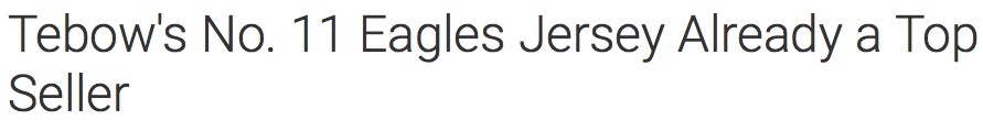2) The three types of Tebow jerseys were already the Top 3 sellers on the site by midday Tuesday. Of course they were! Top sellers are akin to something trending on Twitter. Of course the new, famous guy accounted for the top-selling product on the Eagles’ website yesterday as opposed to, say, DeMarco Murray, who’s been here for a month. Our top-selling t-shirt yesterday was the eagle Tebowing, and while it’ll be a good seller, that doesn’t mean it’s our all-time best-seller already.