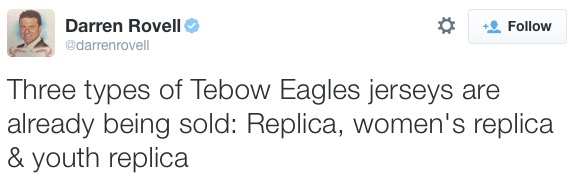 3) Often, online jersey orders from the manufacturer, league or team – again, with some exceptions – are fulfilled to order on blank jerseys. It makes the most sense that way. Marketers markup popular players and create skus so it’s easier for customers to find, but I’d be willing to bet that whether you order a Bradford or Tebow jersey, it’s still getting printed on-demand. This likelihood is even lost on Darren Rovell – ostensibly a business reporter, but actually an idiot – who joined the chorus: