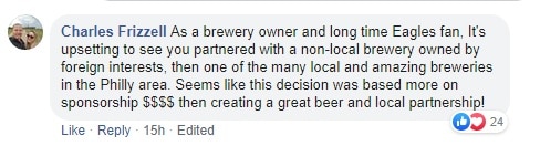 It’s not local, though, and people complained about this. Goose is a Chicago-based brewery but owned by AB InBev (Anheuser-Busch), which is the reason for the ire. If you go through the Facebook and Twitter comments you’ll see a lot of annoyance with the fact that the Eagles did something with a big corporation instead of one of the regional craft joints.
