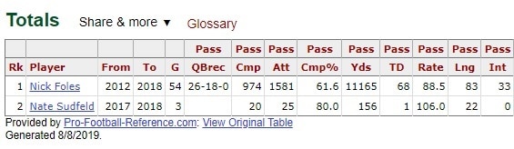 This is kind of a dumb exercise, but just to put it in another format, here’s what the team lost in Foles vs. what they now have in Sudfeld as a backup, after the jump: