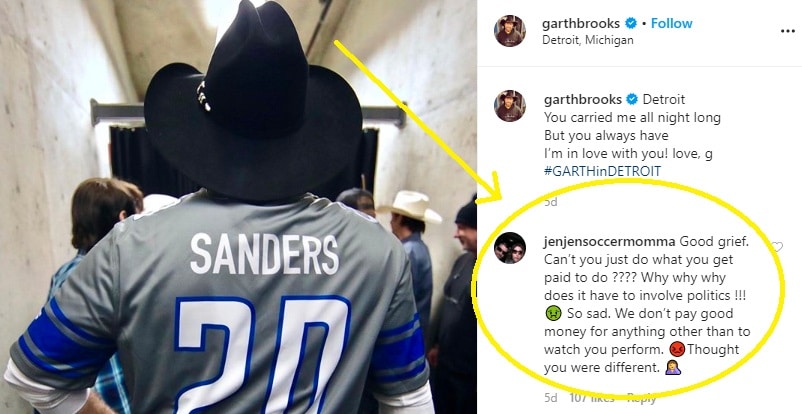 Garth Brooks played a show in Detroit recently and decided to wear the jersey of Hall of Fame running back Barry Sanders. Barry wore the #20 during his playing days, but some morons, nitwits, and dopes thought the jersey was a reference to Bernie Sanders 2020, so they ripped Garth on social media, saying stuff like this: