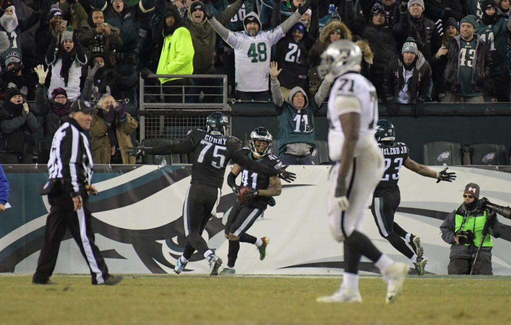 One, Birds vs. Raiders, that hideous game the day after Christmas when Nick Foles was trying to lock in the #1 seed. It was 10-10 with a minute left. Darby picked off Derek Carr to give the Eagles the ball near midfield, then they moved it it down to 31 to kick what would end up being the game-winning field goal.