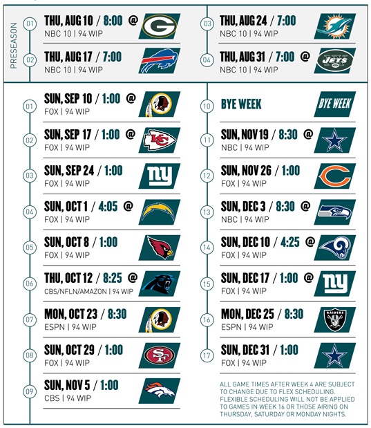 Notes: No prime time games until Week 7, and then they have two in a row, and 3 of their next 5. Good bye week. They get the Cowboys, at night, three days before their Thanksgiving game– Cowboys fans must be PISSED. I LOVE those December prime time games. I’m cozy just thinking about it! Brutal late schedule though.