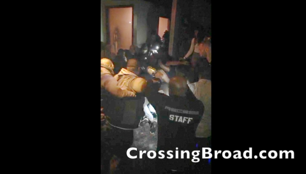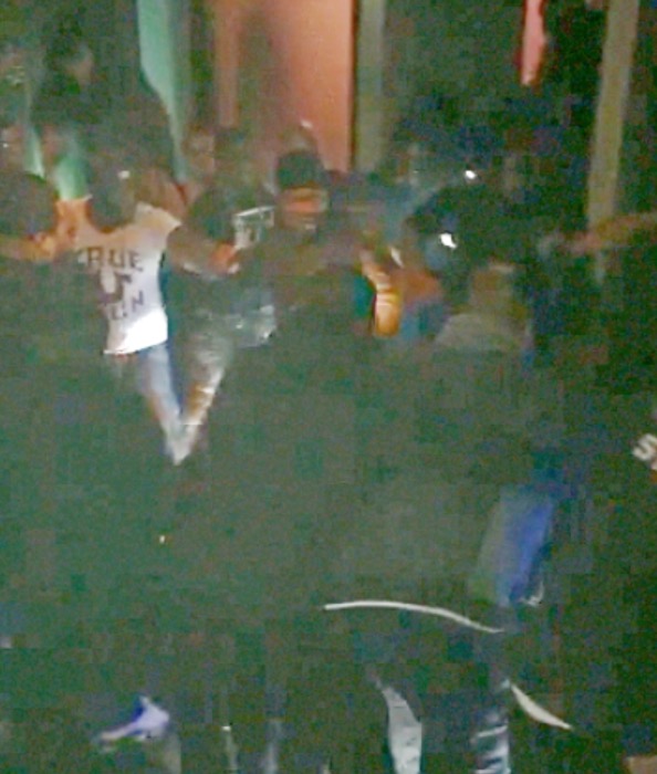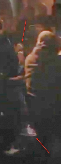 We were able to slow down and brighten the original HD video shot on an iPhone 6. Doing so reveals a bright shoe, similar to the one worn by McCoy, entering the altercation between a staff member and, it appears, someone swinging a bottle: