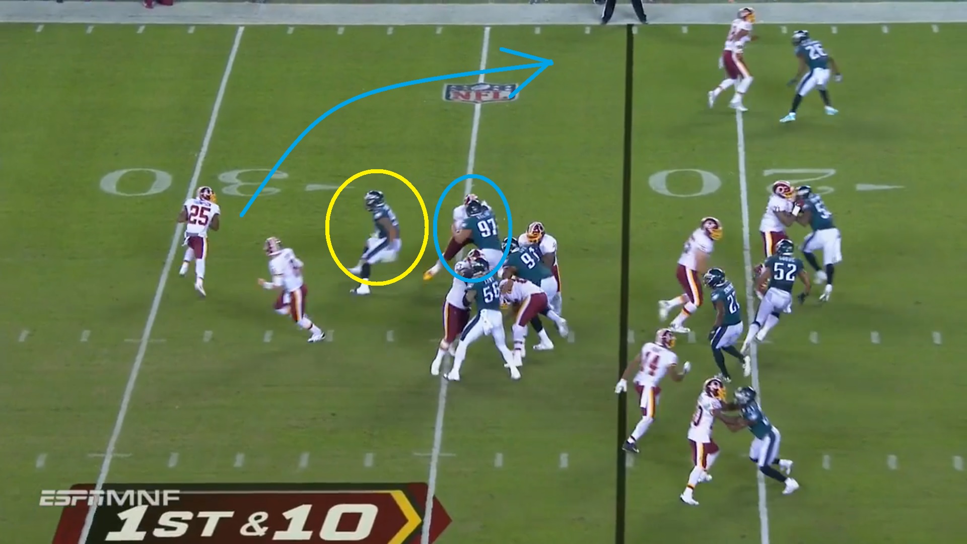 On this one, Vinny Curry got sucked in and allowed Cousins to sneak by on bootleg action: