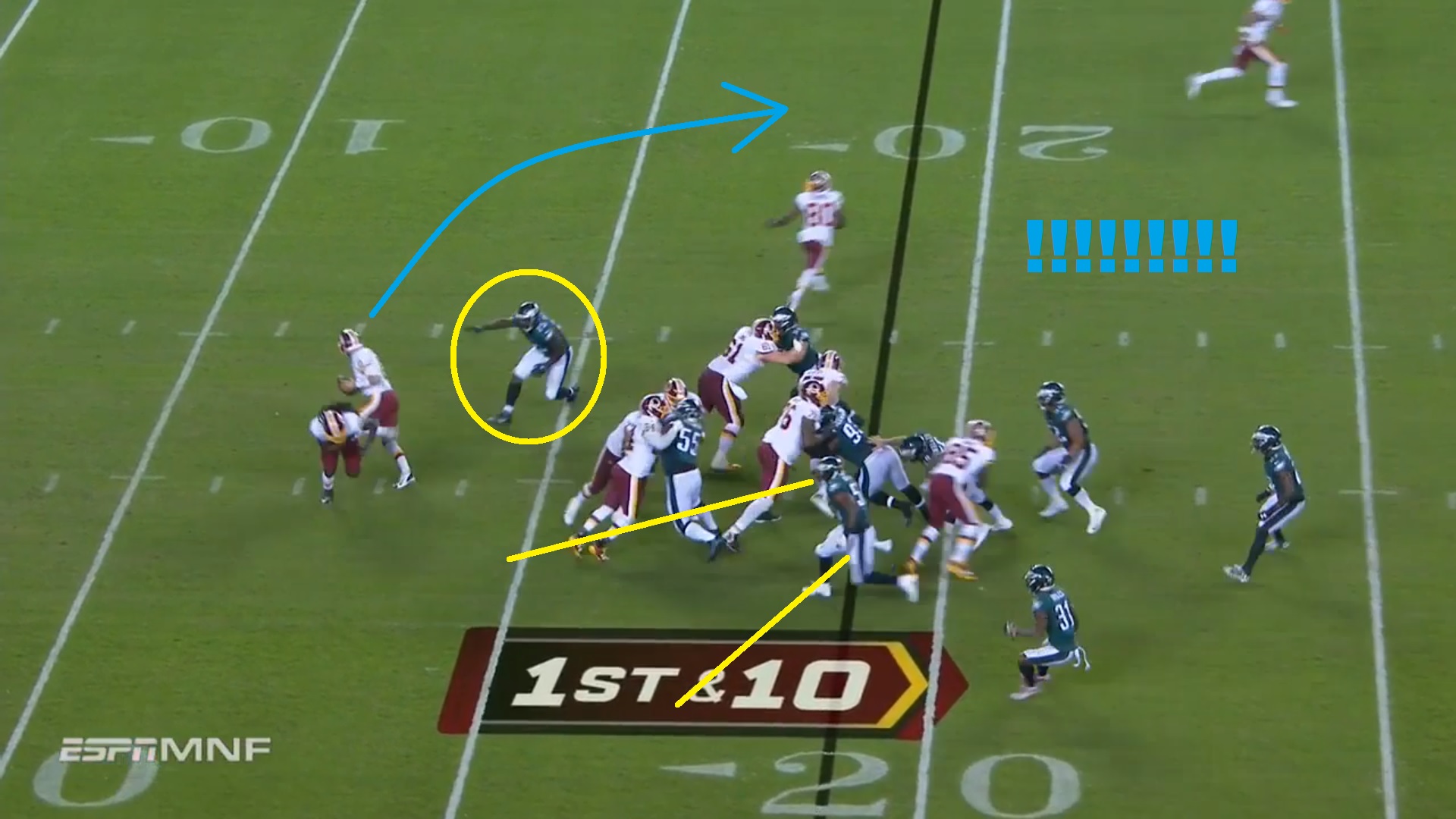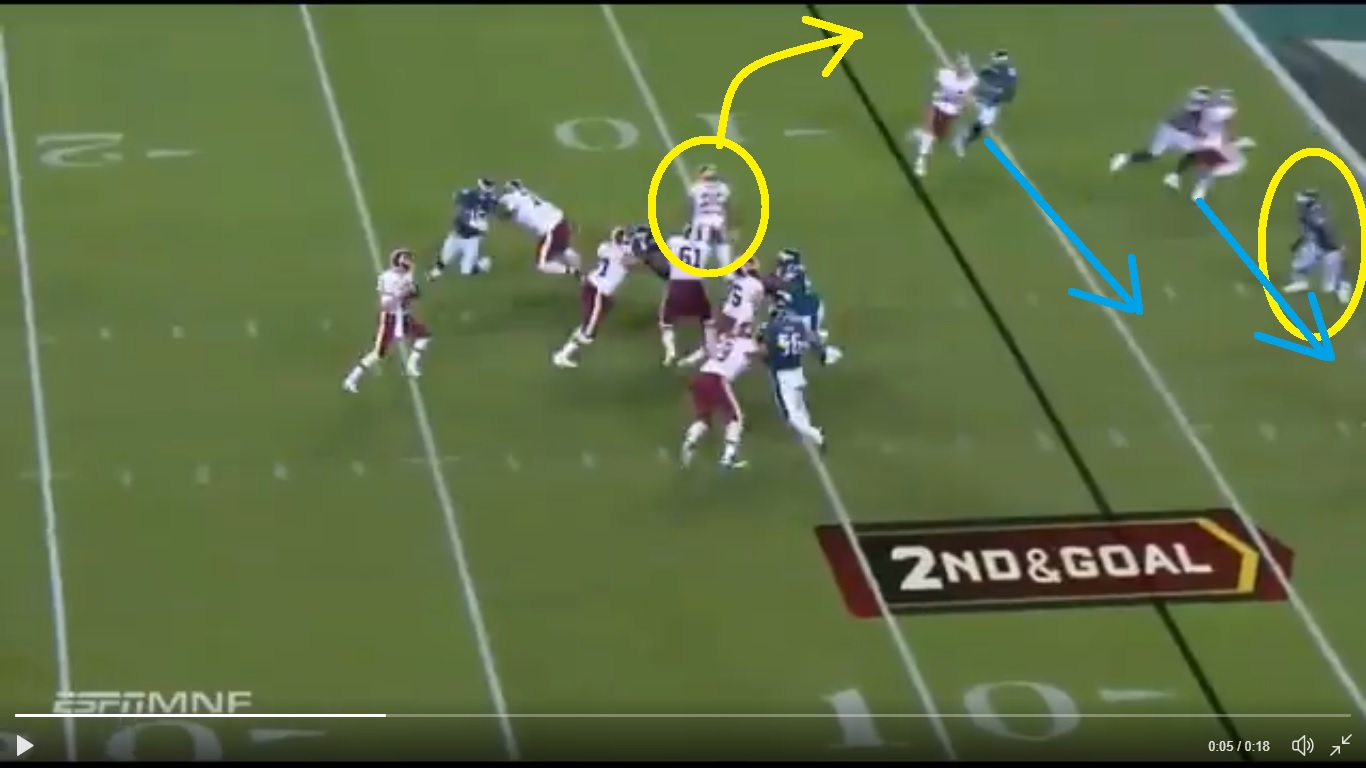 On the first touchdown pass, Goode again got lost in the middle of the field and didn’t slide over to pick up Chris Thompson coming out of the backfield: