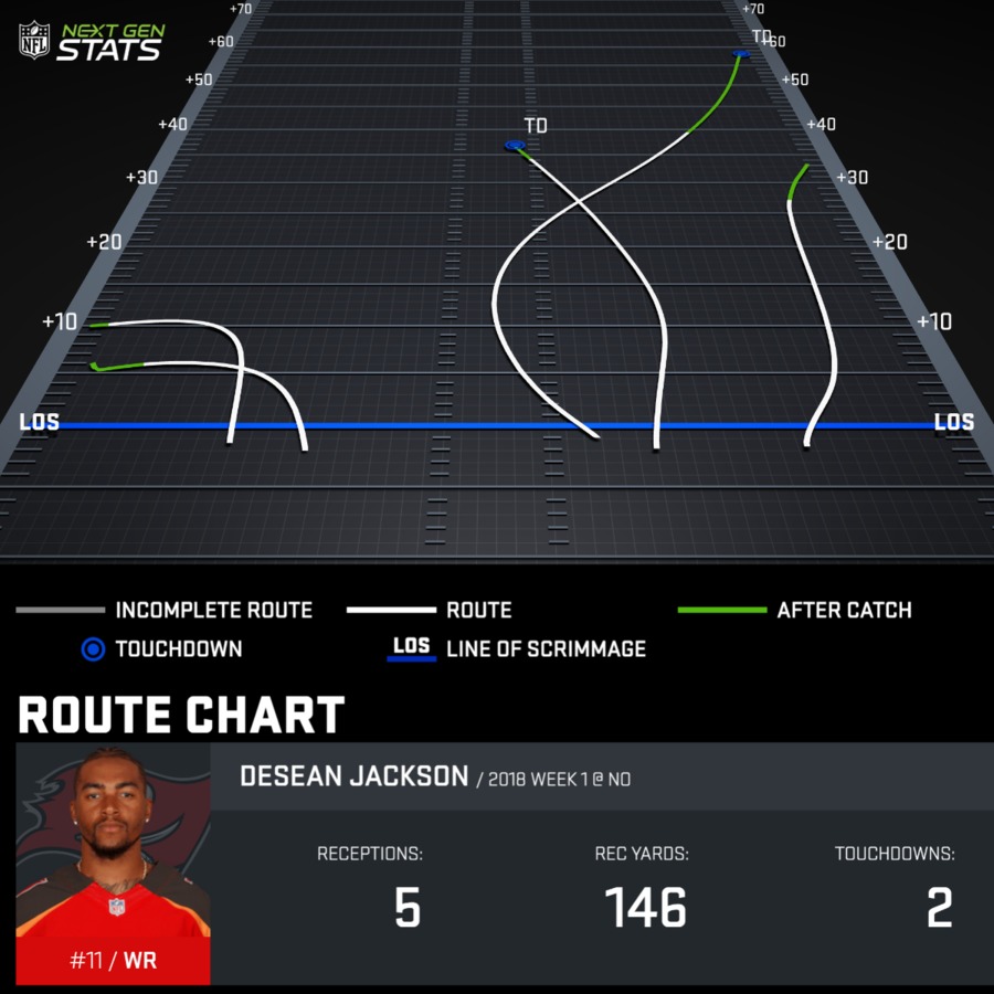 - DeSean Jackson caught his early touchdown coming out of the slot and his late touchdown just a few yards off the right hash mark. He ran a bunch of routes from inside starting positions and did play a handful of snaps on the outside, but generally was not on the field when the Bucs went four and five wide. In those instances, Cameron Brate and O.J. Howard were sometimes out there with Adam Humphries in the slot.