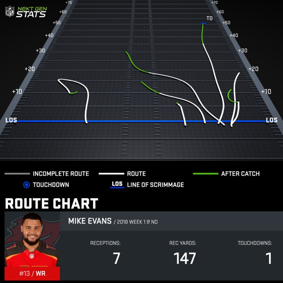On the far right, that completion was a huge 3rd down catch that moved the chains with a little less than eight minutes remaining in the 4th quarter. Tampa had just run the ball twice without much success and would have given the ball right back to New Orleans without that connection. And on the touchdowns, you see how they lined him up on the inside and torched the Saints on a post route and a loopy flag route.