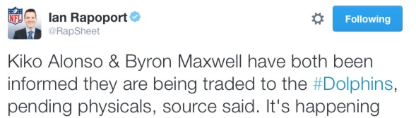 This is what we have to give up to get the Dolphins to take Byron Maxwell off our hands? Hear me out: Kiko Alonso is dirt cheaper – under $1 million – and has only one year left on his deal. He could be a terrific player. He was decimated by injuries last season. Could he really suck? Yes. Is it possible his early-season injuries last year completely ruined any chance he had at success in an already-porous defense? YES.
