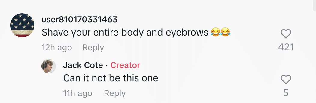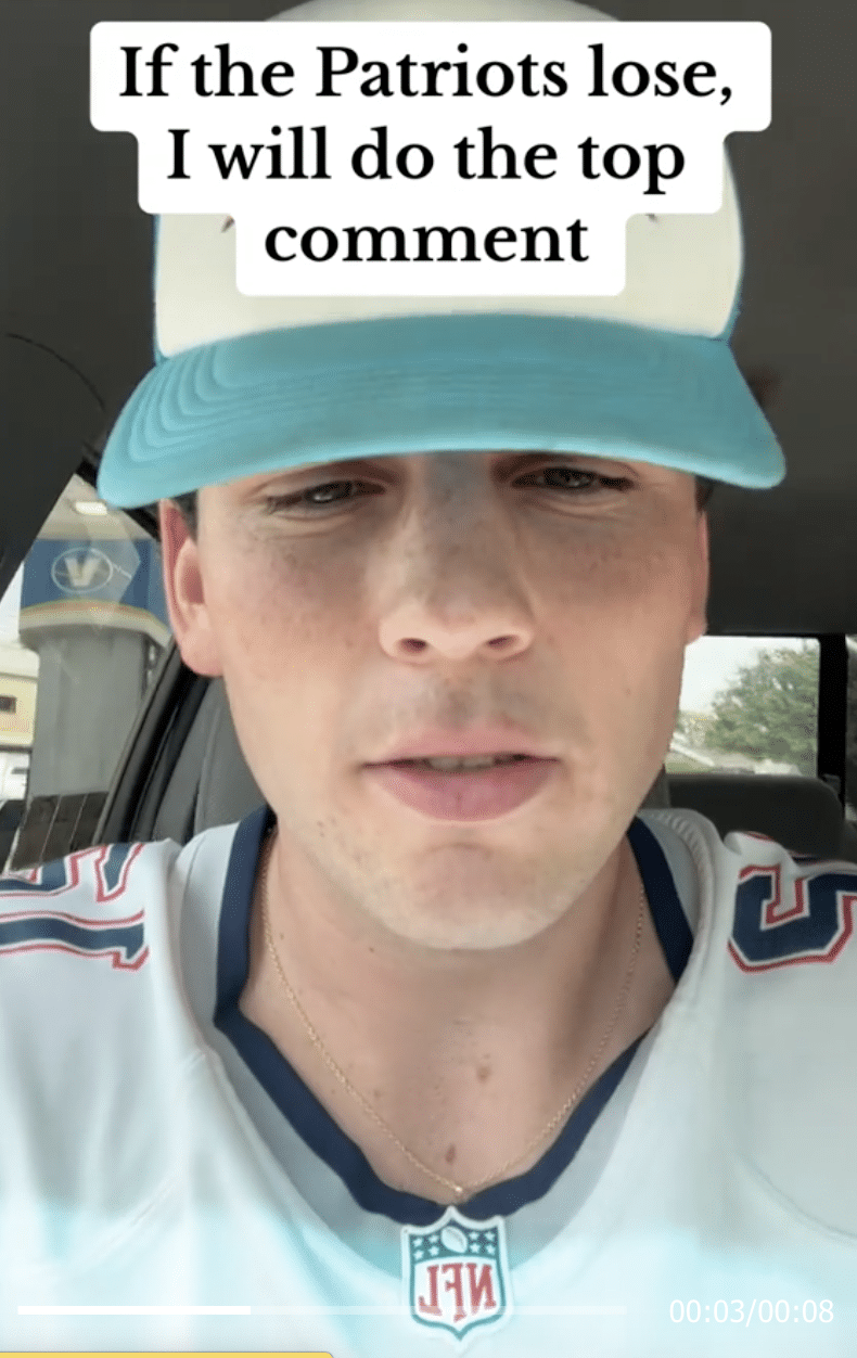 This guy Jack Cote made a TikTok for his 134k followers before the Patriots game. In it he said if the Patriots lost he’d do whatever the top comment was:
