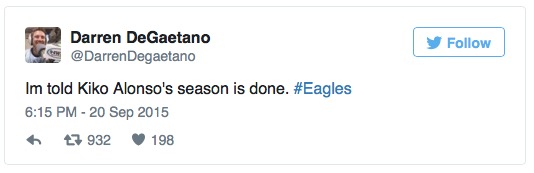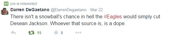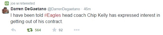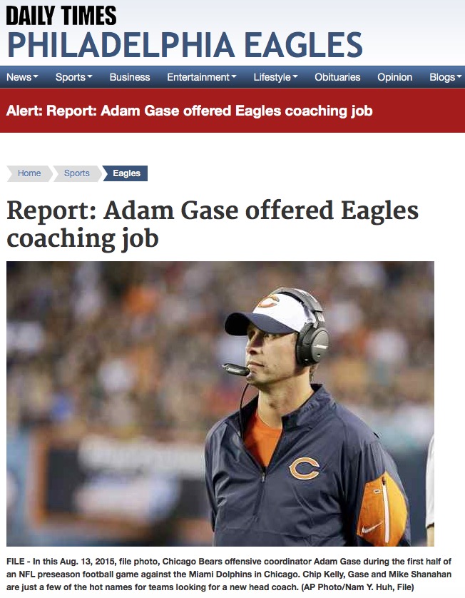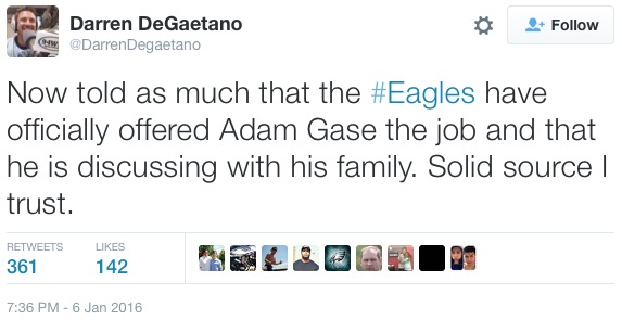Darren DeGaetano, a former WIP-er who now runs a football site and has a habit of ejecting less-than-truths, tweeted that the Eagles have already offered Gase, a report he already began to walk back when he talked to Angelo Cataldi and the morning team on WIP this morning: