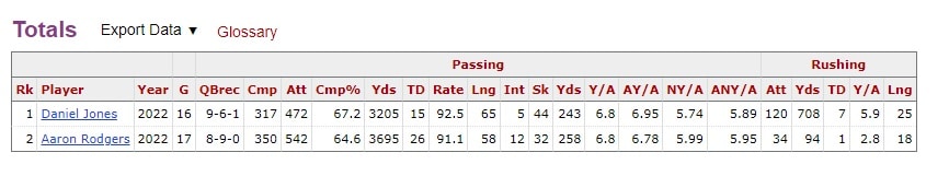 Jones had the better statistical year. Better completion percentage, better TD/INT ratio, and seven scores on the ground to go along with 700 rushing yards. Jalen Hurts he is not, but Danny Dimes can scoot a bit. Rodgers was dealing with a screwed-up thumb and a rib injury, and his last season in Green Bay was forgettable, but he logged three-straight 13-win seasons from age 36-38.