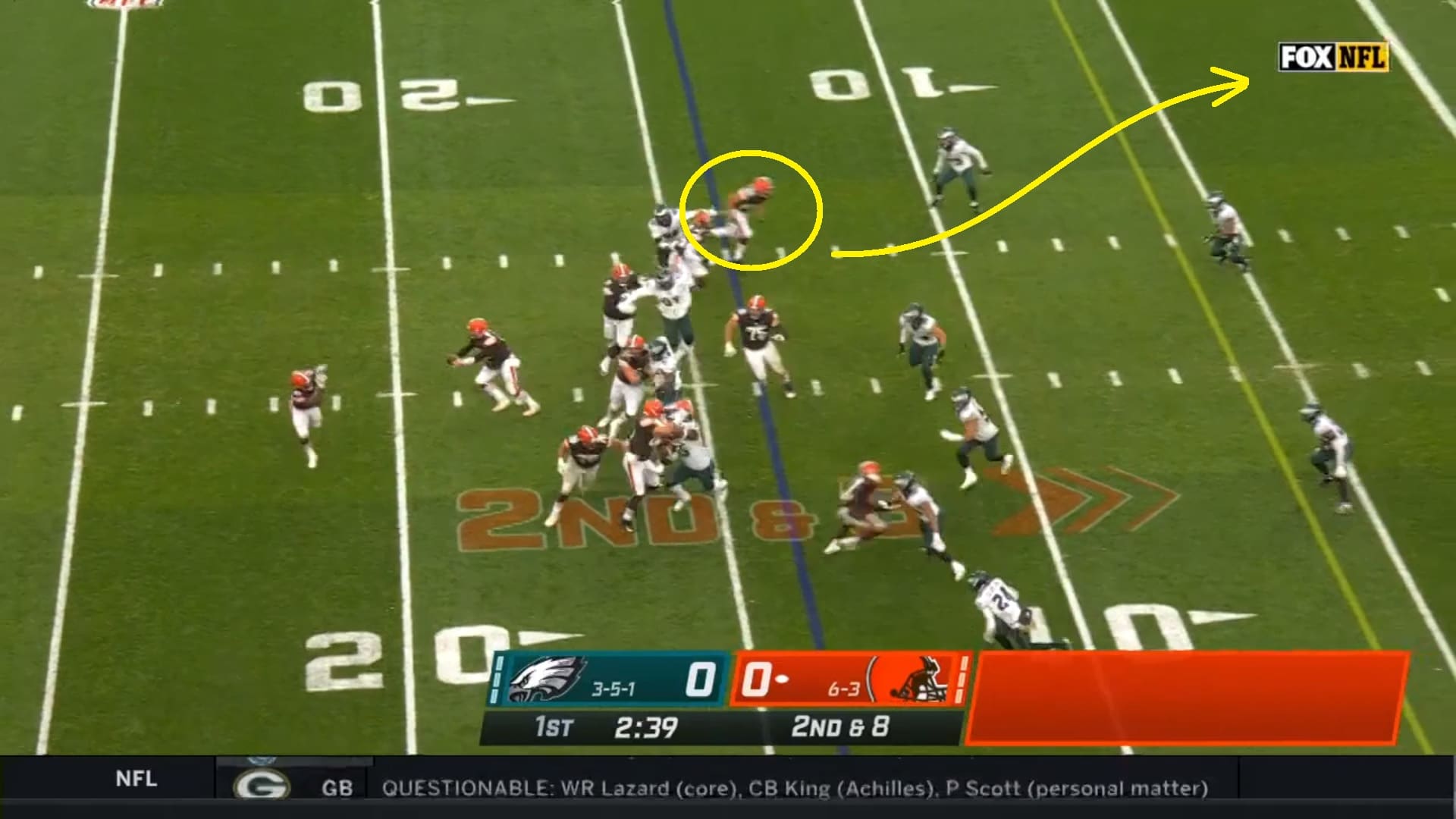- Cleveland cowardly rushing three and allowing a 22-yard completion on the first Eagles drive