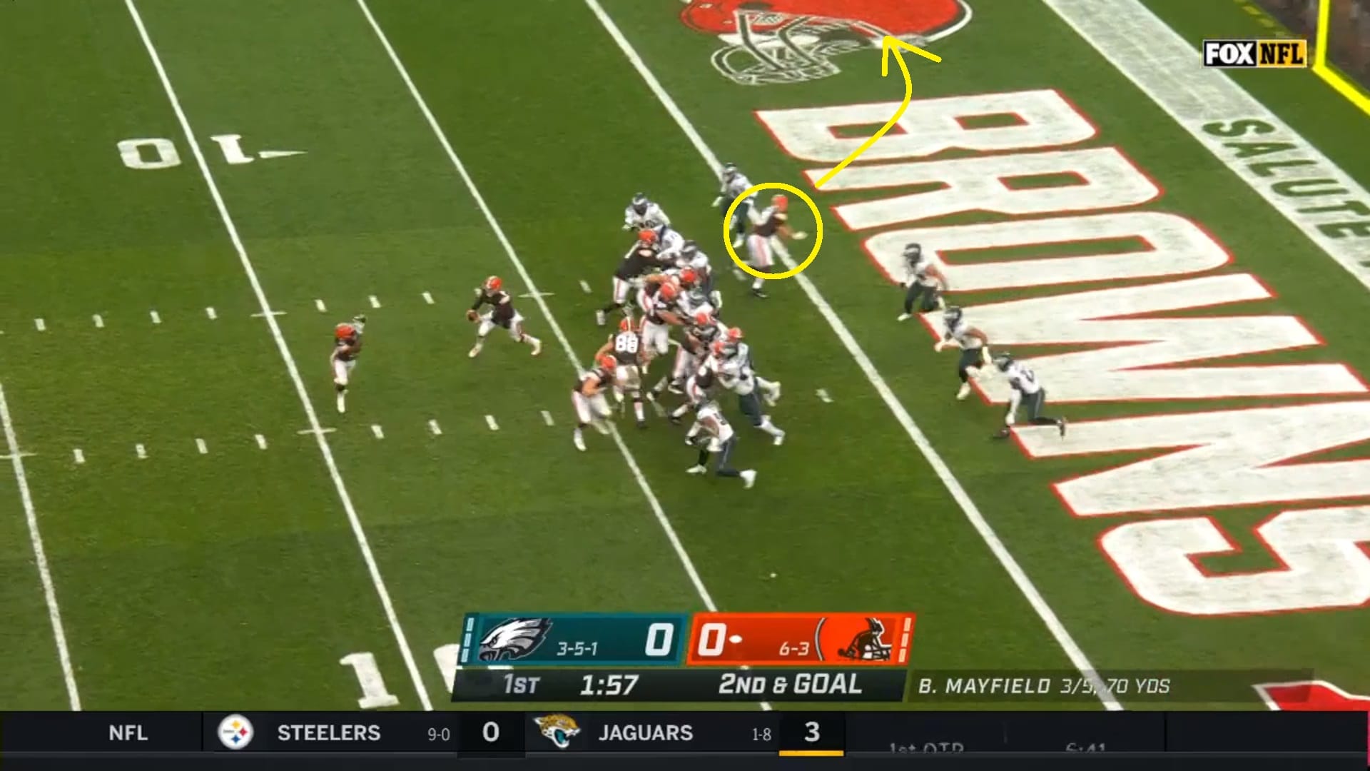 It’s really simple stuff. The Browns love to get the defense moving one way, then they’ll sneak out that tight end and try to catch the weakside corner or linebacker out of position. That picture up there is from the play where Avonte Maddox committed pass interference.