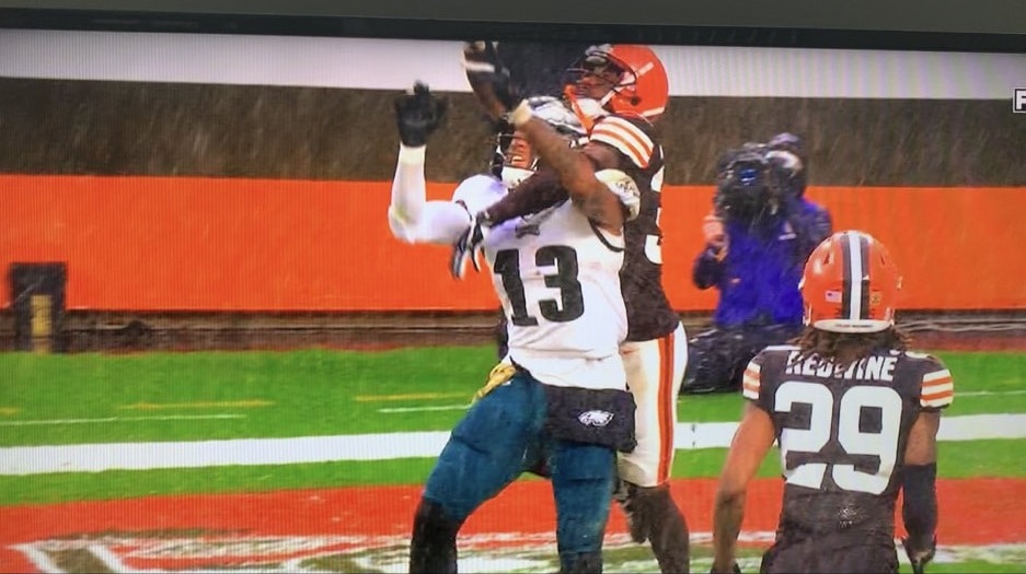 On the interception that ended up being overturned on replay, it was pass interference. It was obvious pass interference against Travis Fulgham: