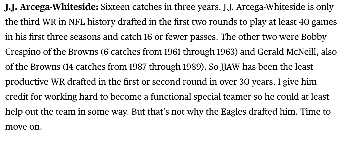 The only problem is when you’re drafted as high as JJAW was, in a skill position, you need immediate impact and need to be more than an enforcer. But Nick was in a no-win situation when he was asked if the Eagles needed another wide receiver to put the group over the top. You could see the wheels spinning in Sirianni’s head – “say something nice about JJ. say something nice about JJ,” after he buried Jalen Reagor on the depth chart moments earlier while the guy who drafted both is sitting six inches away. Credit to Nick for finding anything positive to say about the winner for “least productive WR drafted in the 1st or 2nd round ever” (via Reuben Frank at NBC Sports Philadelphia) –