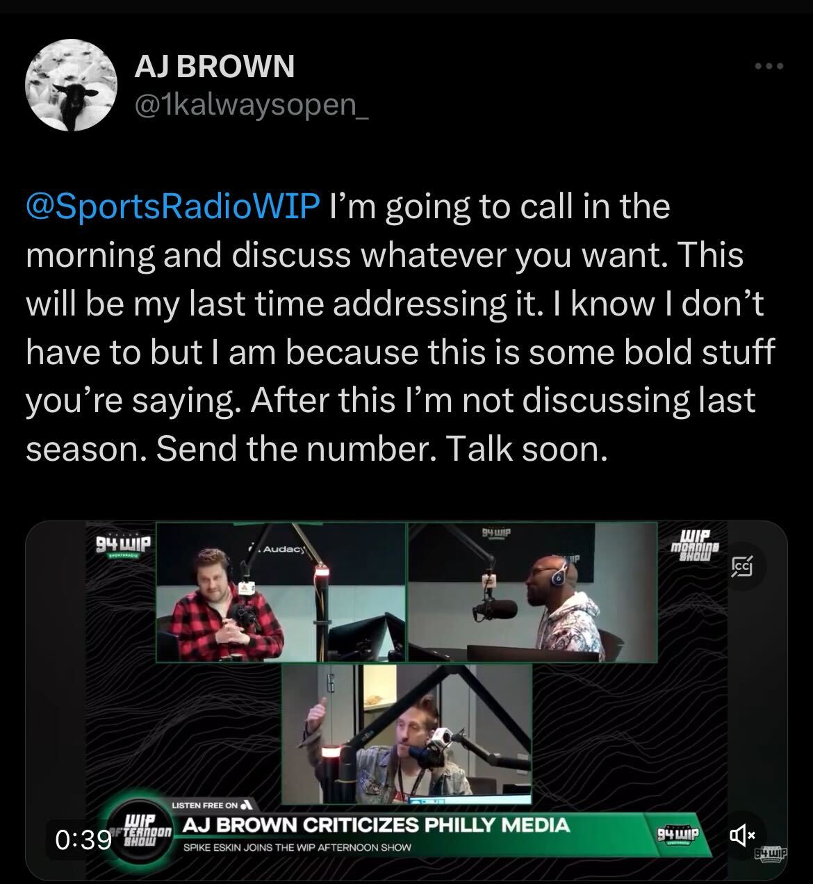 He didn’t call in the morning or the mid-day. So you should probably be ready in case he calls in, right? “I wanted to know the answer to the Kellen Moore question!” Nobody listening to that interview tuned in to hear what A.J. Brown thinks of Kellen Moore. “Cut Jack a little bit of a break.” Jesus. This guy when he listens to afternoons: