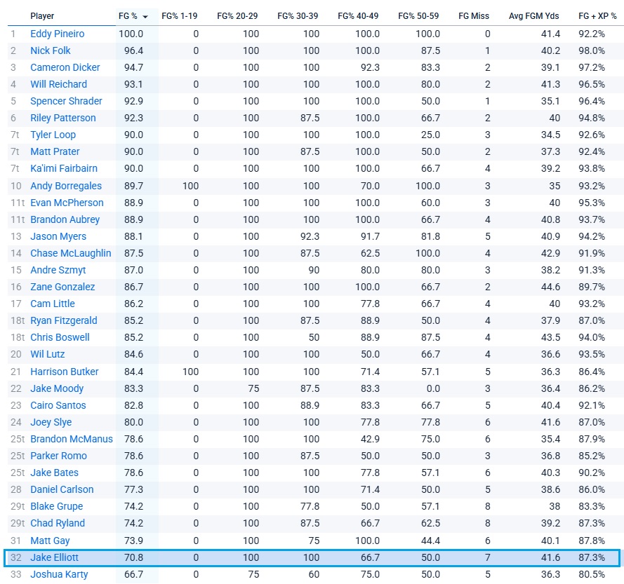 For context, all seven of Elliott’s misses are from 40+. He’s hit everything inside of 40 yards, which amounts to 7 for 7, but most kickers are now hitting those with relative ease.