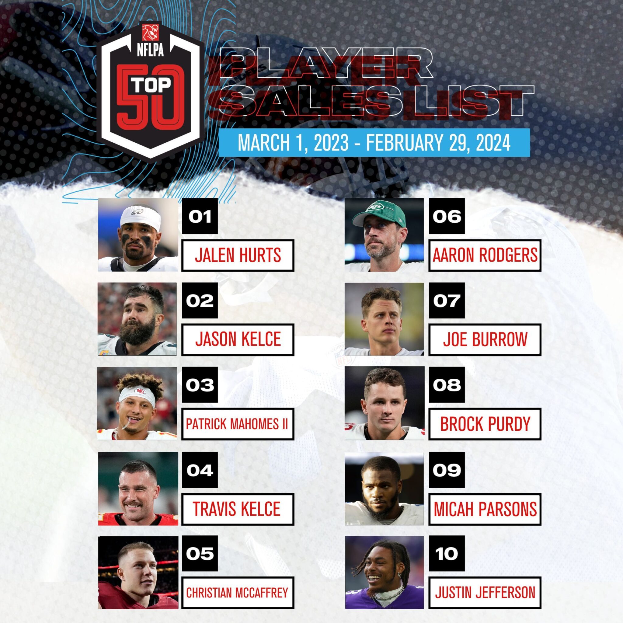 The list ranks the top retail performers in the league based on sales of officially licensed NFL player products from March 1, 2023 to February 29, 2024. It provides the most up-to-date and comprehensive sales figures available. The Top 50 Player Sales List is a key indicator of the most marketable and influential players, impacting their endorsements and overall earning potential.