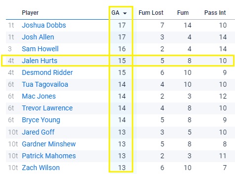 For some context, Hurts only had eight turnovers in the 15 games he played last year, a combination of two lost fumbles and six interceptions to put him in a four-way tie for 29th. He threw nine picks and lost two fumbles during his first full year as a starter, so he’s already crested career-worst numbers with four games left to play.