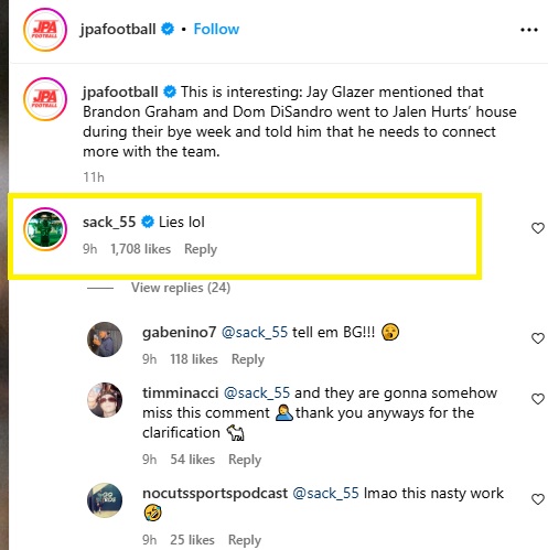 B.G. is responding to a short, written synopsis of a portion of the report, so it’s possible he didn’t even see the original video, which is basically two reports wrapped into one. There’s the team meeting portion, then the assertion that Graham and Big Dom went to meet with Jalen Hurts about connecting with teammates, which B.G. suggests is not true. Could use some clarification from him, or maybe it’s best that he doesn’t speak for the rest of the year.