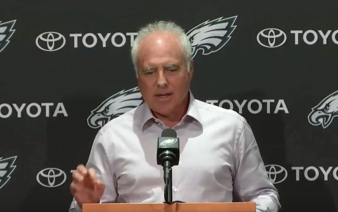 Jeffrey Lurie decided to hold an impromptu press conference today to the sheer unadulterated delight of the assembled media. He kicked things off by full-on doubling-down on the job Howie Roseman has done. Like, aggressively so. The beginning of this video is a full on fellation of Howie. Bold for a guy who went 7-9 last year and whose new acquisitions haven’t yet stepped on the field this year. If the Eagles flame out – like they did when Howie built the Dream Team – Lurie is going to look foolish. This wasn’t an endorsement of Howie– it was a flat-out stamp of approval on his ability as a GM.