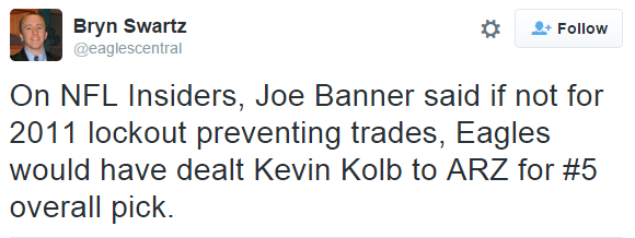 The audio of Banner’s story is around the 17:20 mark here. And, the way Joe tells it, the Eagles wouldn’t have even given up their first rounder from 2011 in exchange. In such a stacked draft, that means the Eagles could have walked out with Patrick Peterson AND their own pick, Eagles legend Danny Watkins. Oh, what could have been.