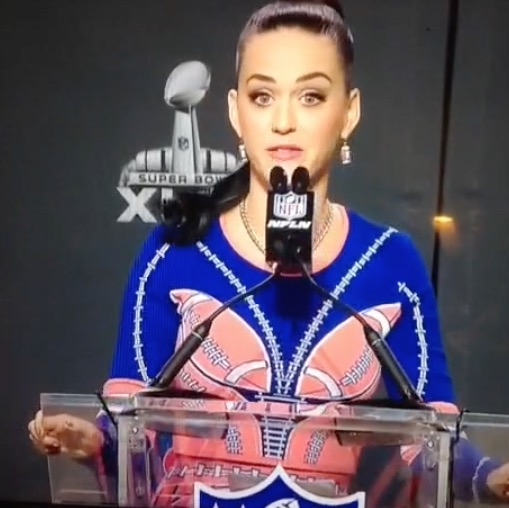 Katy Perry Showed up to Her Pre-Super Bowl Press Conference with Football Boobs and Said Nothing about Her Performance Will Be Deflated